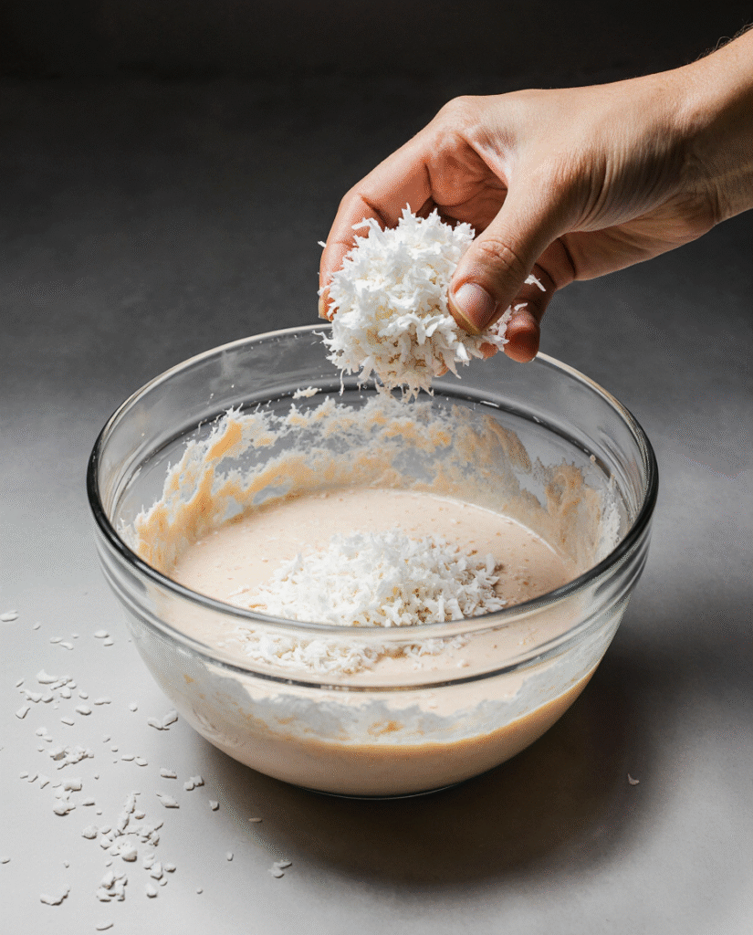 Gently fold in 1 cup of shredded unsweetened coconut. This step not only adds texture but infuses every bite with coconut goodness.
